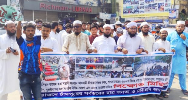 শাপলা চত্বর, পিলখানা এবং জুলাই গণঅভ্যুত্থানে গণহত্যার বিচার এবং আওয়ামী লীগকে নিষিদ্ধের দাবিতে চাঁদপুরে বিক্ষোভ মিছিল অনুষ্ঠিত হয়েছে।