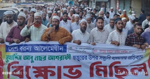 চাঁদপুরের কচুয়া-১ আসনে সম্ভাব্য সাংসদ সদস্য পদপ্রার্থী দেশ বরণ্য আলেমেদ্বীন, মাওলানা মুহাদ্দিস আবু নছর আশরাফী হুজুরের উপর সন্ত্রাসী হামলার প্রতিবাদে বাংলাদেশ জামায়াতে ইসলামী চাঁদপুর শহর শাখার উদ্যোগে বিক্ষোভ মিছিল ও সমাবেশ অনুষ্ঠিত হয়েছে।