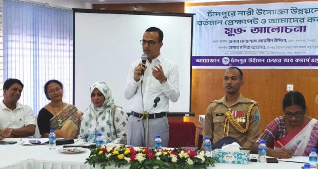 চাঁদপুরে নারী উদ্যোক্তা উন্নয়নের বর্তমান প্রেক্ষাপট ও করণীয় শীর্ষক মুক্ত আলোচনা অনুষ্ঠিত হয়েছে। চাঁদপুর জেলা উইমেন চেম্বার অব কমার্স এন্ড ইন্ডাস্ট্রির আয়োজনে ২৯ এপ্রিল বিকেল ৪ টায় চাঁদপুর ওয়াইডব্লিউসিএ স্কুল মিলনায়তন কক্ষে এ আলোচনা অনুষ্ঠিত হয়।