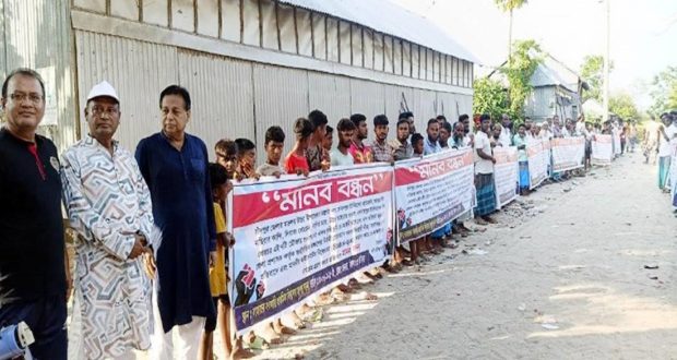 মানববন্ধনে আরও বক্তব্য রাখেন প্রফেসর রূপ নারায়ণ, ইউপি সদস্য মো. শাহাদাত হোসেন, নজরুল ইসলাম, খোকন বেপারী, আনছার সৈয়াল, মো. মিলন মুন্সি, বোরহান মিয়াজি, ইকবাল মাঝি, রানু বেগম ও মনির হোসেন গাজি।