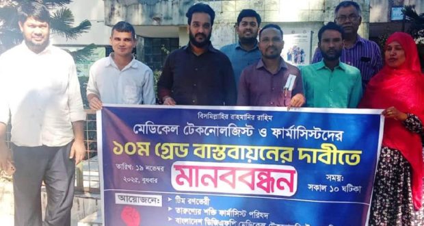 মেডিকেল টেকনোলজিস্ট ও ফার্মাসিস্টদের ১০ম গ্রেড বাস্তবায়নের দাবীতে মানববন্ধন করা হয়। বুধবার চাঁদপুরের কচুয়া উপজেলা স্বাস্থ্য কমপ্লেক্স চত্বরে টিম রণভেরী, তারুণ্যের শক্তি ফার্মাসিস্ট পরিষদ ও ডিজিএফপি মেডিকেল টেকনোলজিস্ট এসোসিয়েশনের আয়োজনে মানববন্ধন করা হয়েছে।