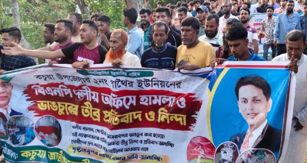 চাঁদপুরের কচুয়া উপজেলার ২নং পাথৈর ইউনিয়নের বেরকোটা গ্রামে শুক্রবার সন্ধায় স্থানীয় বিএনপির দলীয় কার্যালয়ে হামলা, নেতাকর্মীদের ছবি সম্মিলিত ব্যানার, ফেস্টুন ছিড়ে ফেলা ও আসবাবপত্র ভাংচুরের ঘটনায় বিক্ষোভ মিছিল ও মানববন্ধন কর্মসূচী পালিত হয়েছে। রবিবার বিকেলে কচুয়া জাতীয়তাবাদী প্রবাসী কল্যান সংগঠনের আয়োজনে এ মানববন্ধন কর্মসূচী পালন করা হয়। বিক্ষোভ মিছিলে সার্বিক সহযোগীতা করেন কচুয়া জাতীয়তাবাদী প্রবাসী কল্যান সংগঠনের প্রধান উপদেষ্টা মোঃ মহসীন বেপারী, সহ- উপদেষ্টা শিপন বেপারী, সিনিয়র সহ- সভাপতি দিদার হোসেন, সাধারন সম্পাদক আব্দুর রহিম রাজ।