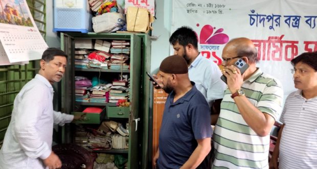 চাঁদপুরে বস্ত্র ব্যবসায়ী সমিতির অফিসে চুরির অভিযোগ পাওয়া গেছে। ঘটনাটি শনিবার সন্ধ্যার পর থেকে রোববার দুপুরের যে কোন সময় জোড়পুকুর বায়তুল ফালাহ জামে মসজিদের তৃতীয় তলায় সমিতির কার্যালয় থেকে তালা ভেঙে নগদ টাকা চুরি হয়।