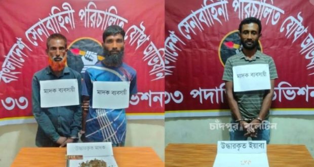 চাঁদপুরের ফরিদগঞ্জে যৌথ বাহিনীর অভিযানে গাঁজা ও ইয়াবাসহ তিন মাদক ব্যবসায়ী গ্রেপ্তার।