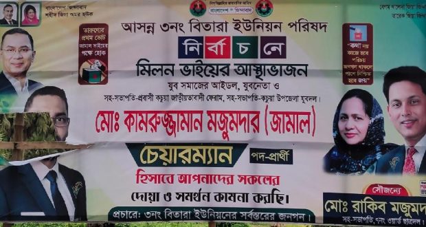 জানা গেছে, বৃহত্তম বিতারা ইউনিয়নের চেয়ারম্যান পদে অনেক প্রার্থী প্রতিদন্ধিতায় মাঠে রয়েছে। তাদের মধ্যে প্রবাসী ফোরামের নেতা মো: কামরুজ্জামান মজুমদার জামান দলীয় নেতাকর্মীদের ছবি সম্মিলিত ব্যানার পোষ্টার সাটিয়ে চমক সৃষ্টি করেছেন। তিনি প্রার্থী হওয়ায় পুরো ইউনিয়ন জুড়ে আলোচনার কেন্দ্রবিন্দুতে জায়গা করে নিয়েছেন।